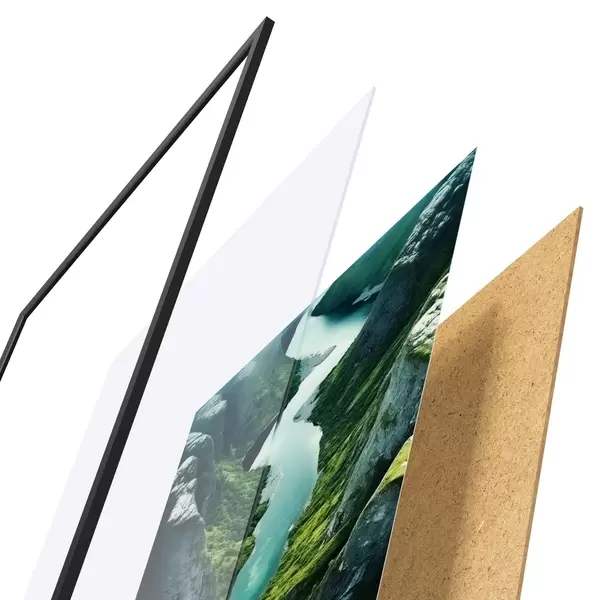 Plakat składa się z ramy, pleksi, wydrukowanego obrazu i podkładu z płyty wiórowej. Plakat można natychmiast zawiesić na ścianie dzięki uchwytom z tyłu.