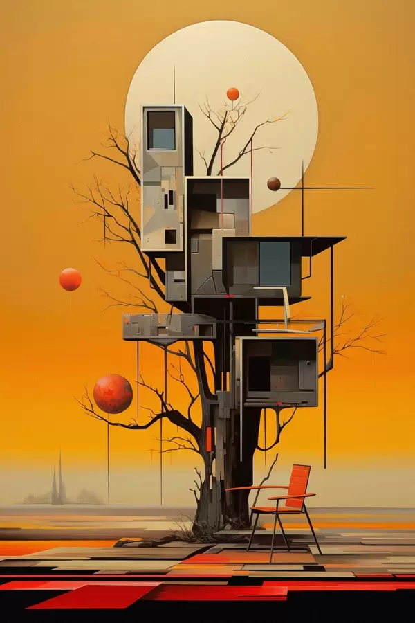 Poster Surrealistyczny domek na drzewie na pomarańczowym tle Nr f46526