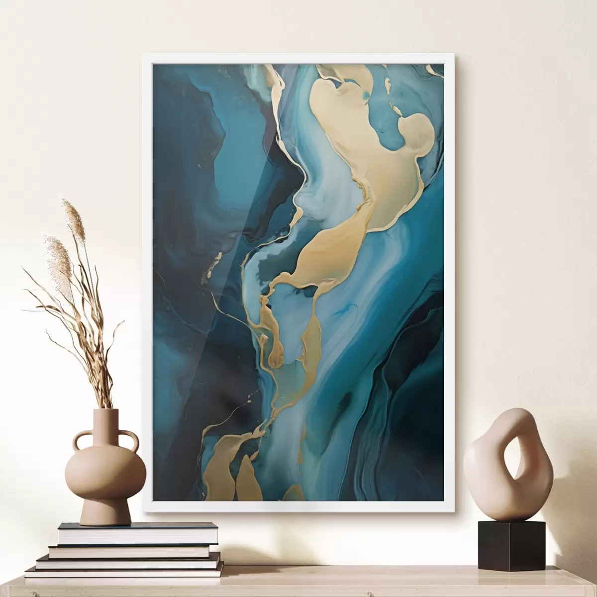 Plakat Turkusowo-niebieski abstrakcyjny wzór z strumieniem ochry f46530