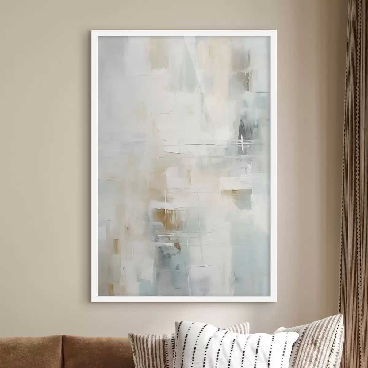 Plakat Powietrzne pociągnięcia pędzla w kolorze niebieskim i beżowym na białym tle f46547