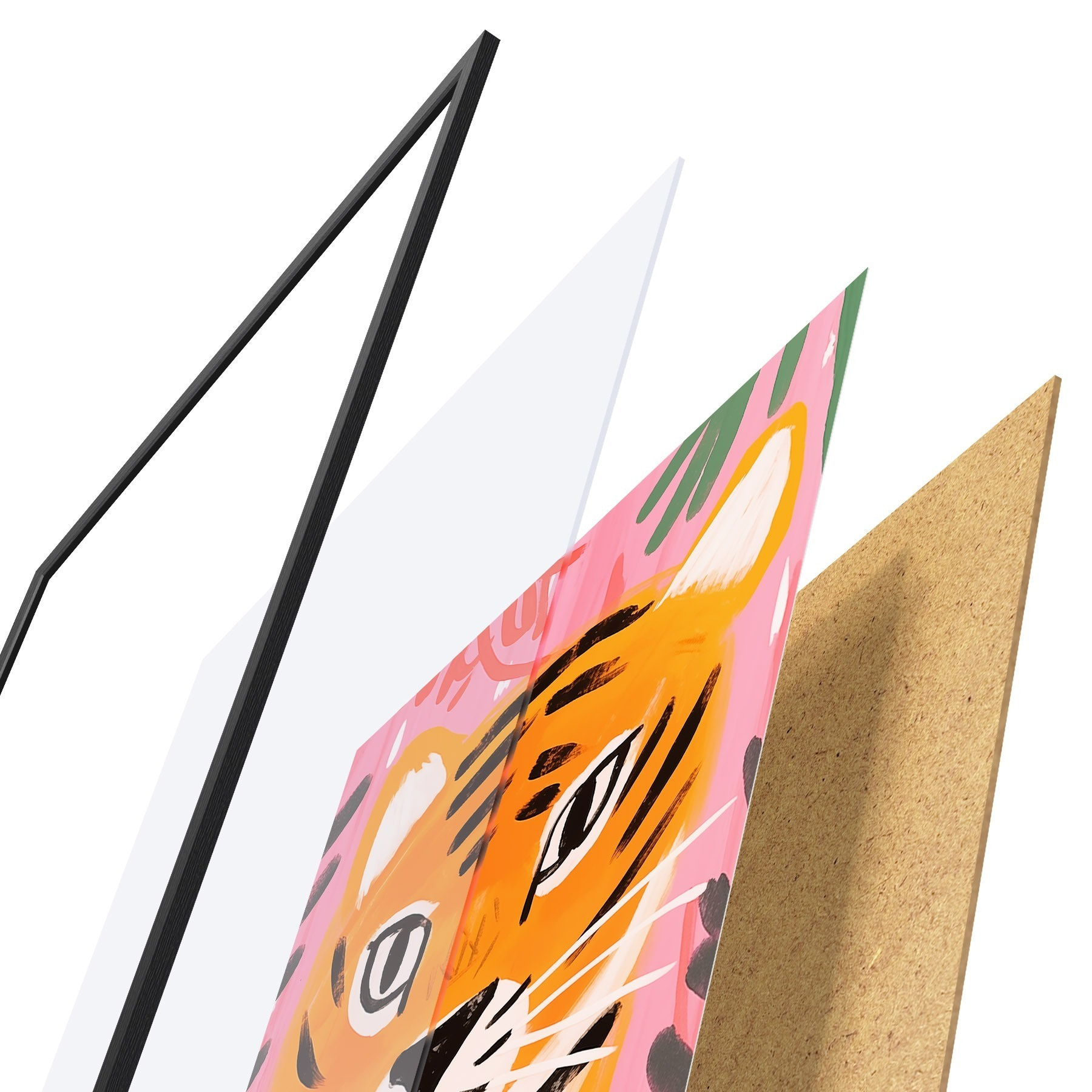 Plakat składa się z ramy, pleksi, wydrukowanego obrazu i podkładu z płyty wiórowej. Plakat można natychmiast zawiesić na ścianie dzięki uchwytom z tyłu.