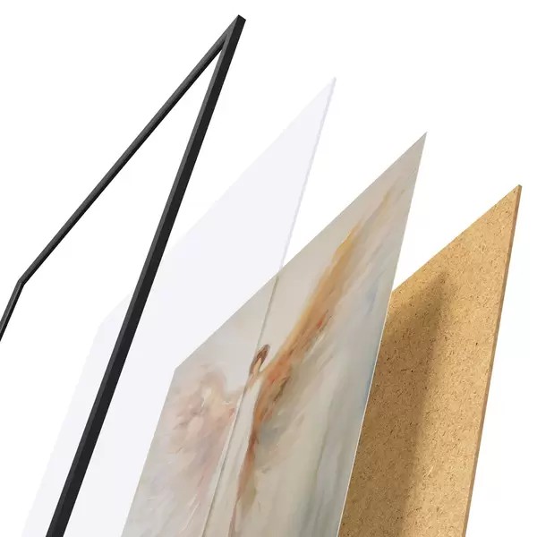 Plakat składa się z ramy, pleksi, wydrukowanego obrazu i podkładu z płyty wiórowej. Plakat można natychmiast zawiesić na ścianie dzięki uchwytom z tyłu.