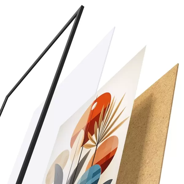 Plakat składa się z ramy, pleksi, wydrukowanego obrazu i podkładu z płyty wiórowej. Plakat można natychmiast zawiesić na ścianie dzięki uchwytom z tyłu.
