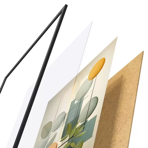 Plakat składa się z ramy, pleksi, wydrukowanego obrazu i podkładu z płyty wiórowej. Plakat można natychmiast zawiesić na ścianie dzięki uchwytom z tyłu.
