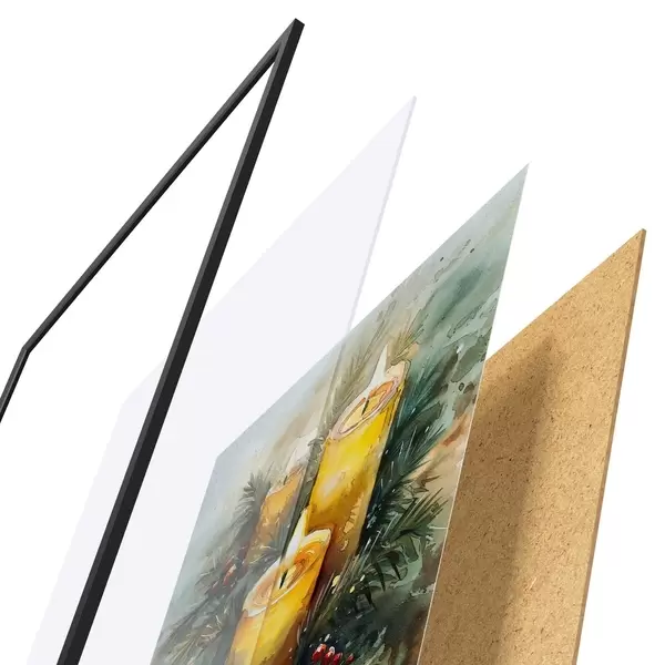 Plakat składa się z ramy, pleksi, wydrukowanego obrazu i podkładu z płyty wiórowej. Plakat można natychmiast zawiesić na ścianie dzięki uchwytom z tyłu.