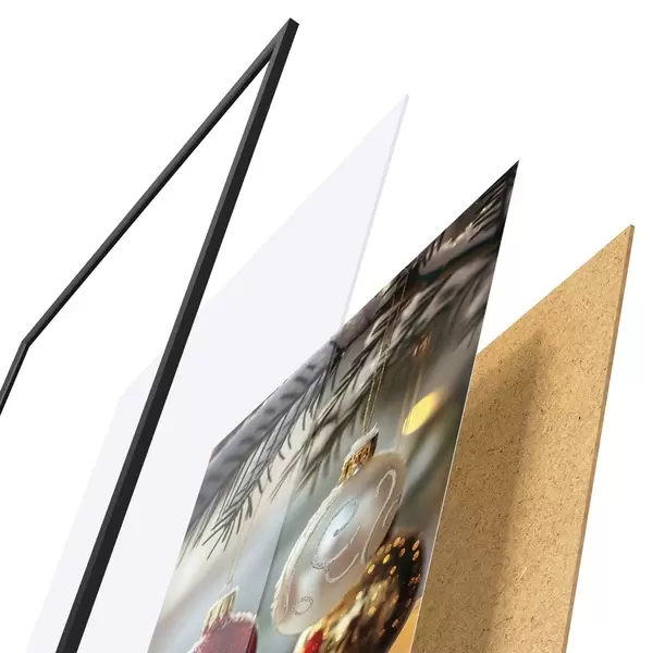 Plakat składa się z ramy, pleksi, wydrukowanego obrazu i podkładu z płyty wiórowej. Plakat można natychmiast zawiesić na ścianie dzięki uchwytom z tyłu.