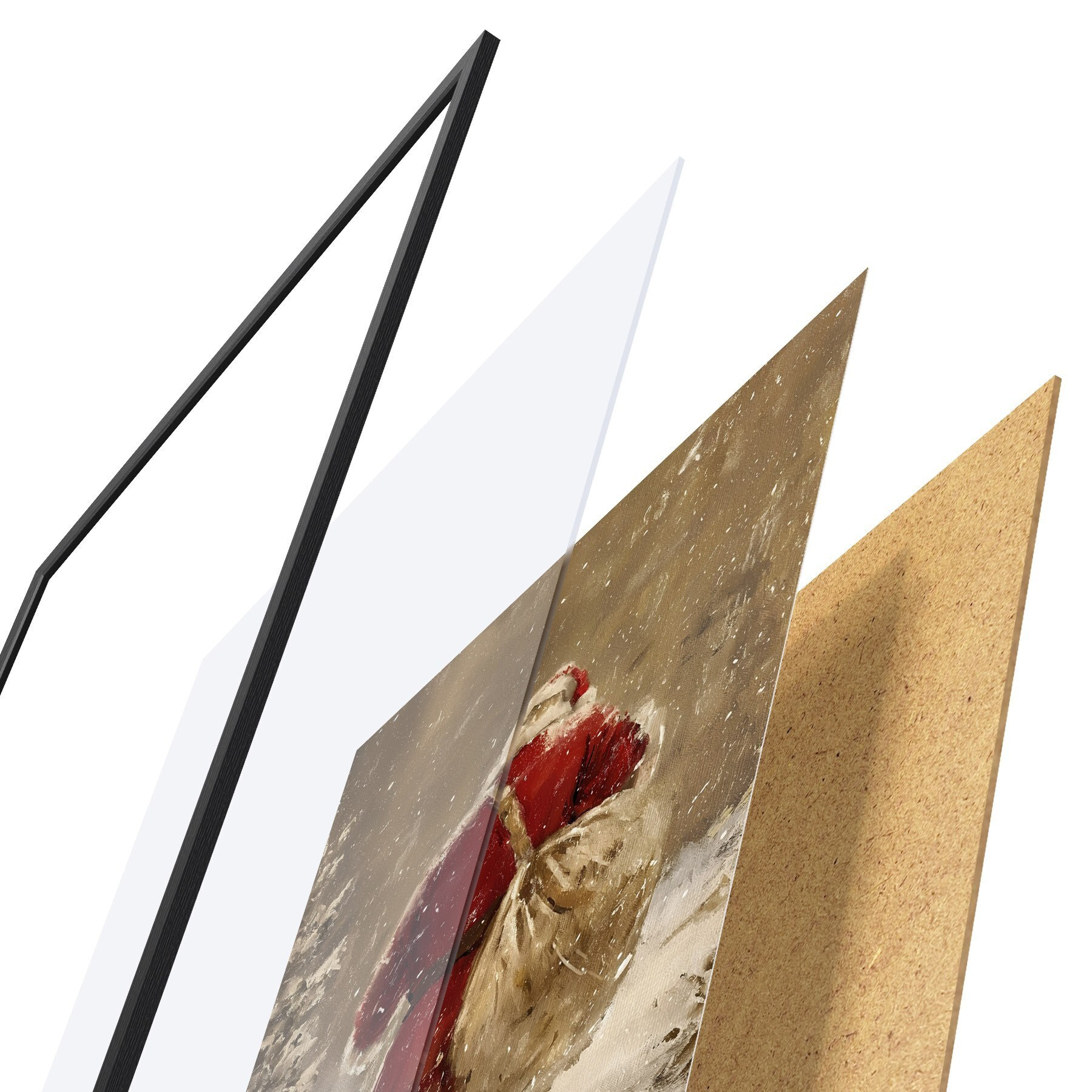 Plakat składa się z ramy, pleksi, wydrukowanego obrazu i podkładu z płyty wiórowej. Plakat można natychmiast zawiesić na ścianie dzięki uchwytom z tyłu.