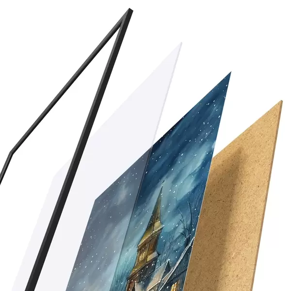 Plakat składa się z ramy, pleksi, wydrukowanego obrazu i podkładu z płyty wiórowej. Plakat można natychmiast zawiesić na ścianie dzięki uchwytom z tyłu.