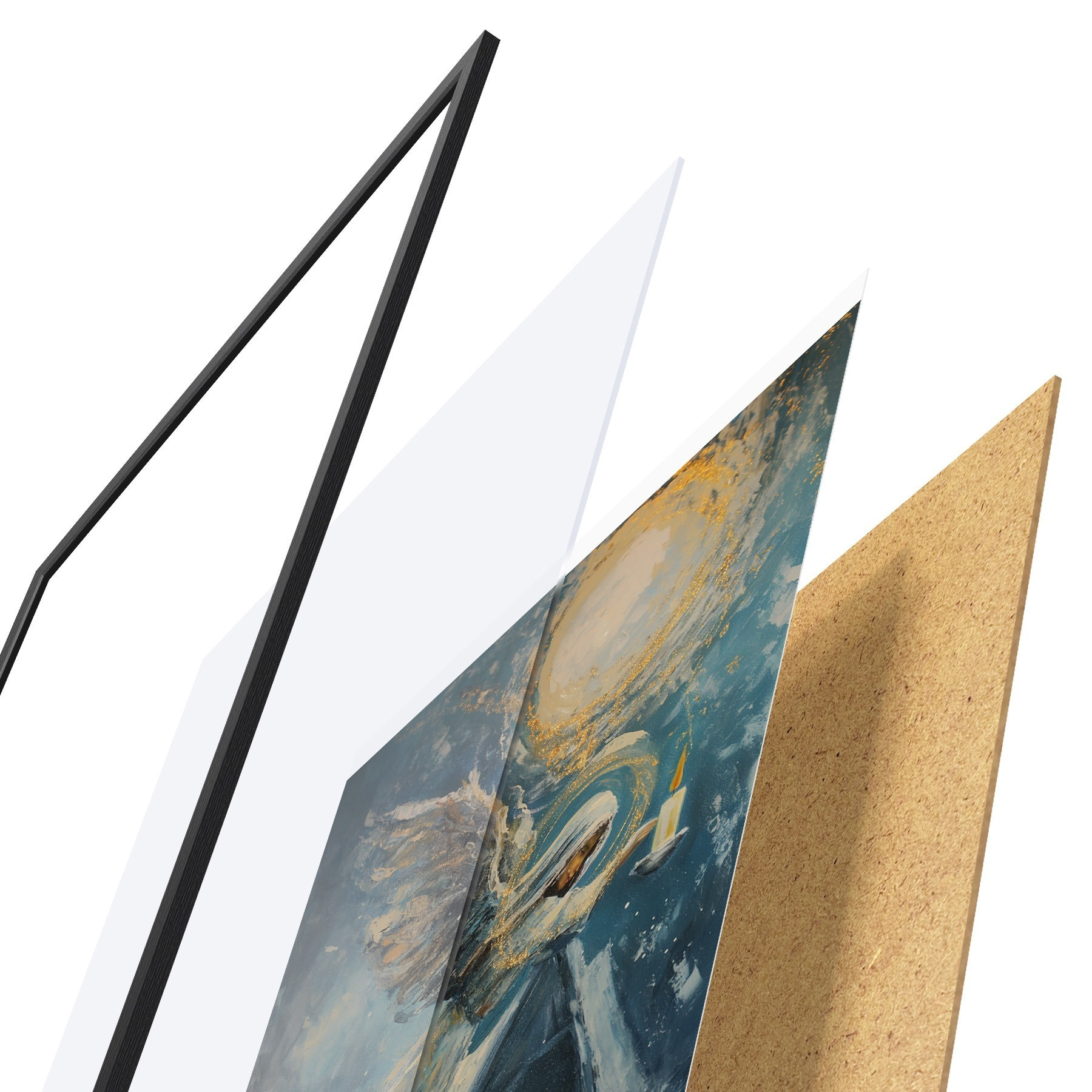 Plakat składa się z ramy, pleksi, wydrukowanego obrazu i podkładu z płyty wiórowej. Plakat można natychmiast zawiesić na ścianie dzięki uchwytom z tyłu.