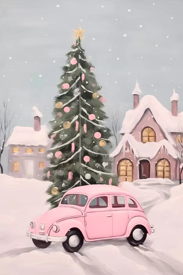 Plakat Różowy samochód i udekorowana choinka przed domem f46621