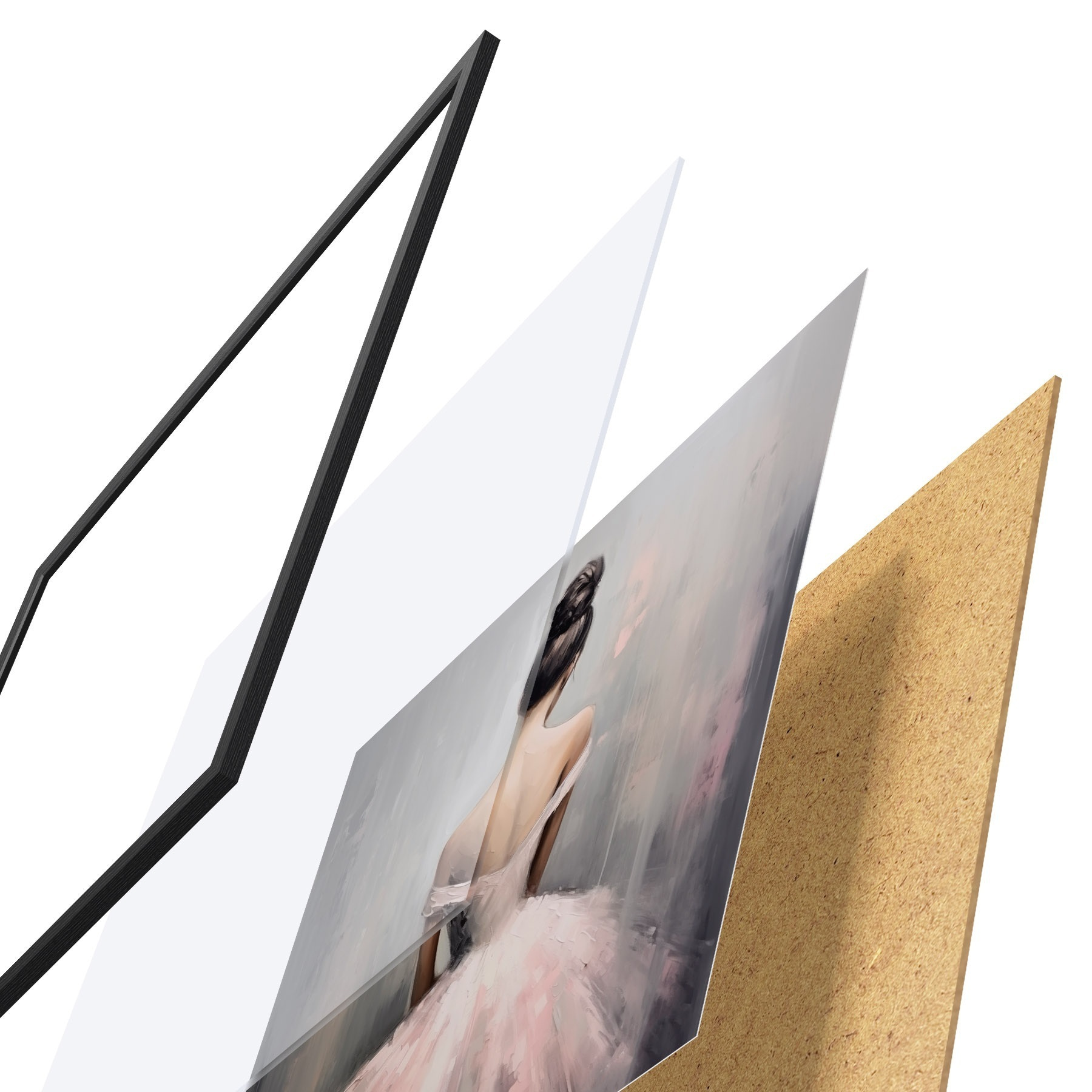 Plakat składa się z ramy, pleksi, wydrukowanego obrazu i podkładu z płyty wiórowej. Plakat można natychmiast zawiesić na ścianie dzięki uchwytom z tyłu.