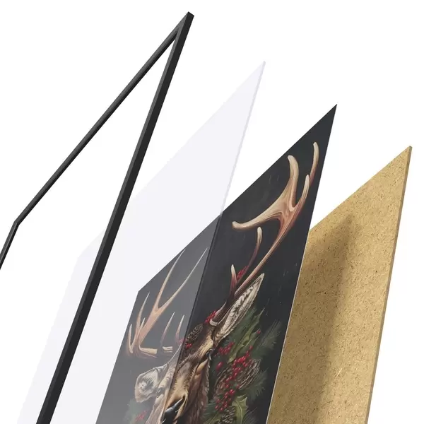 Plakat składa się z ramy, pleksi, wydrukowanego obrazu i podkładu z płyty wiórowej. Plakat można natychmiast zawiesić na ścianie dzięki uchwytom z tyłu.