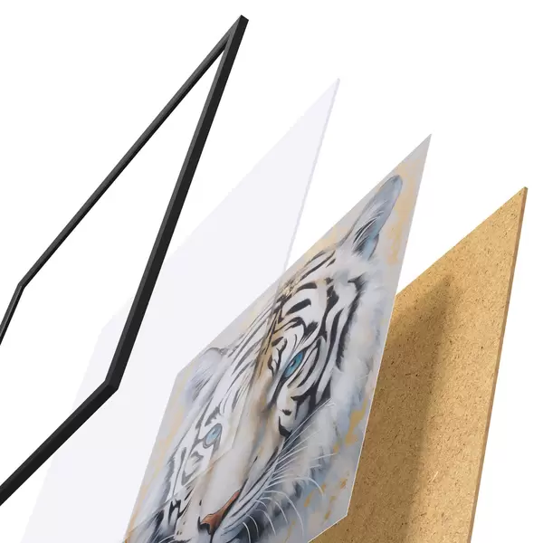Plakat składa się z ramy, pleksi, wydrukowanego obrazu i podkładu z płyty wiórowej. Plakat można natychmiast zawiesić na ścianie dzięki uchwytom z tyłu.