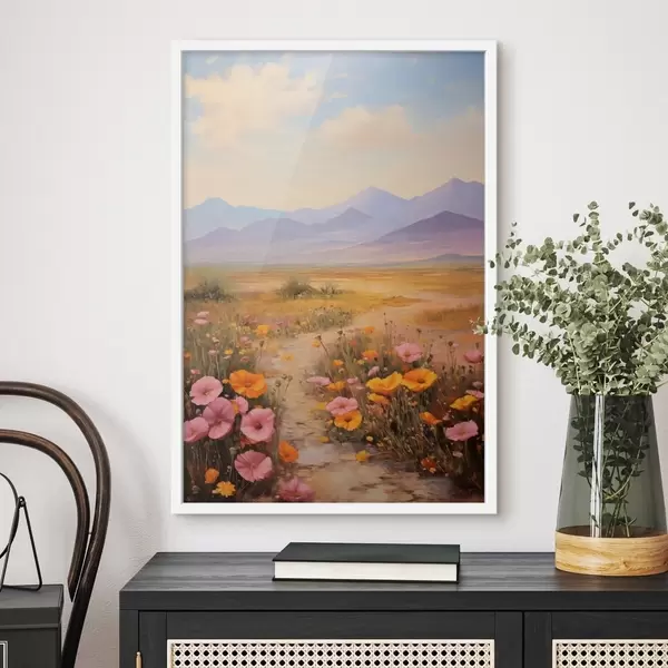 Plakat Krajobraz, pole kolorowych kwiatów z górami w tle, delikatne pastelowe kolory f46686