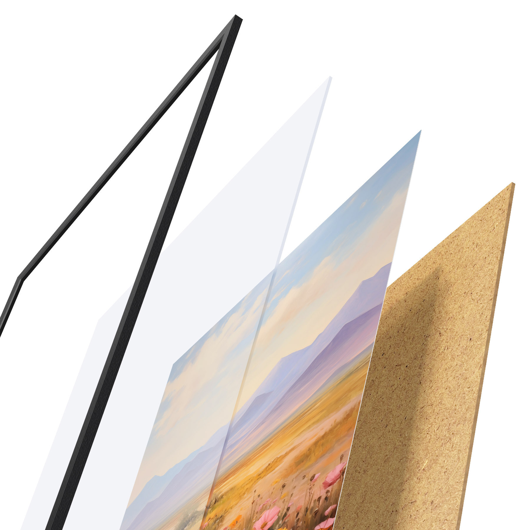 Plakat składa się z ramy, pleksi, wydrukowanego obrazu i podkładu z płyty wiórowej. Plakat można natychmiast zawiesić na ścianie dzięki uchwytom z tyłu.