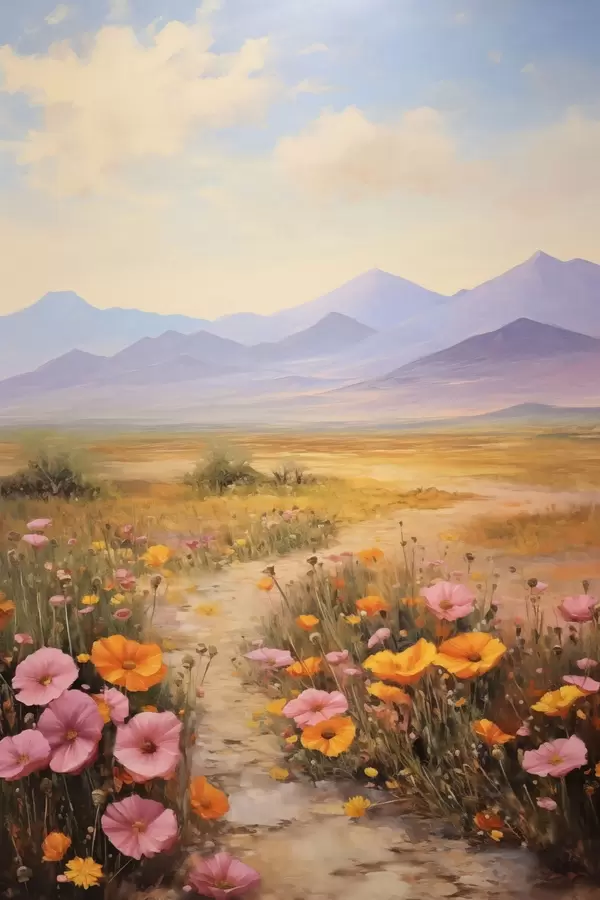 Poster Krajobraz, pole kolorowych kwiatów z górami w tle, delikatne pastelowe kolory Nr f46686