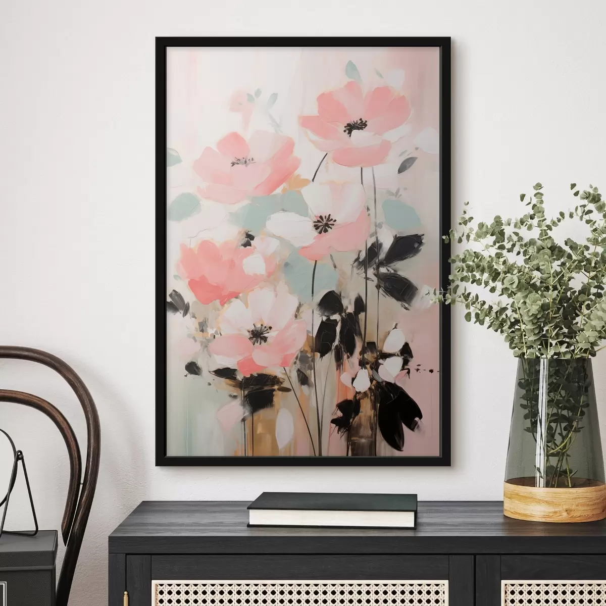 Poster Różowe i czarne kwiaty z liśćmi, delikatne pastelowe kolory, abstrakcyjna kompozycja kwiatowa, minimalistyczna sztuka Nr f46688