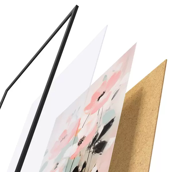 Plakat składa się z ramy, pleksi, wydrukowanego obrazu i podkładu z płyty wiórowej. Plakat można natychmiast zawiesić na ścianie dzięki uchwytom z tyłu.