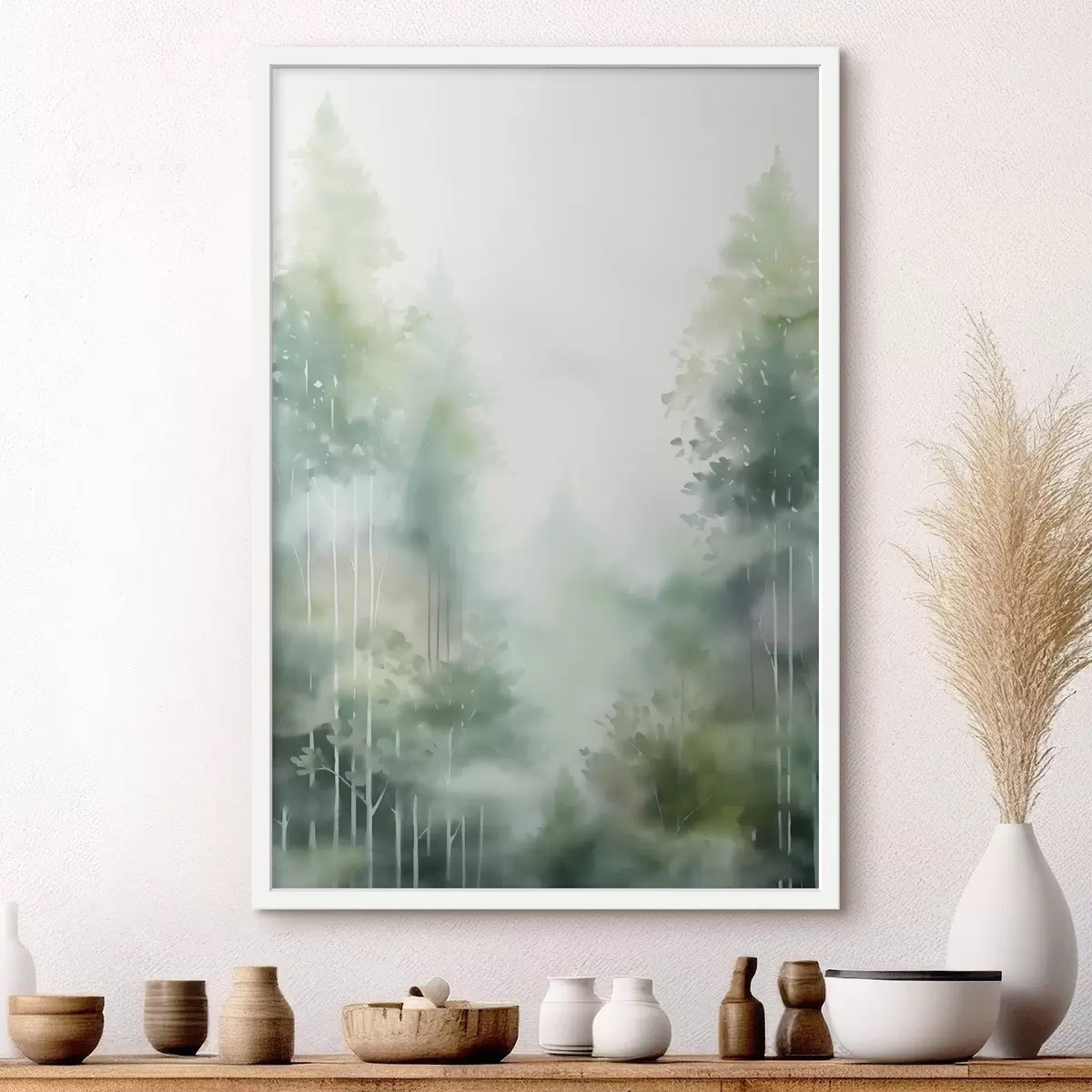 Plakat Akwarelowa imitacja abstrakcyjnego lasu z wysokimi drzewami i zielonymi liśćmi, w delikatnych, stonowanych kolorach. f46689