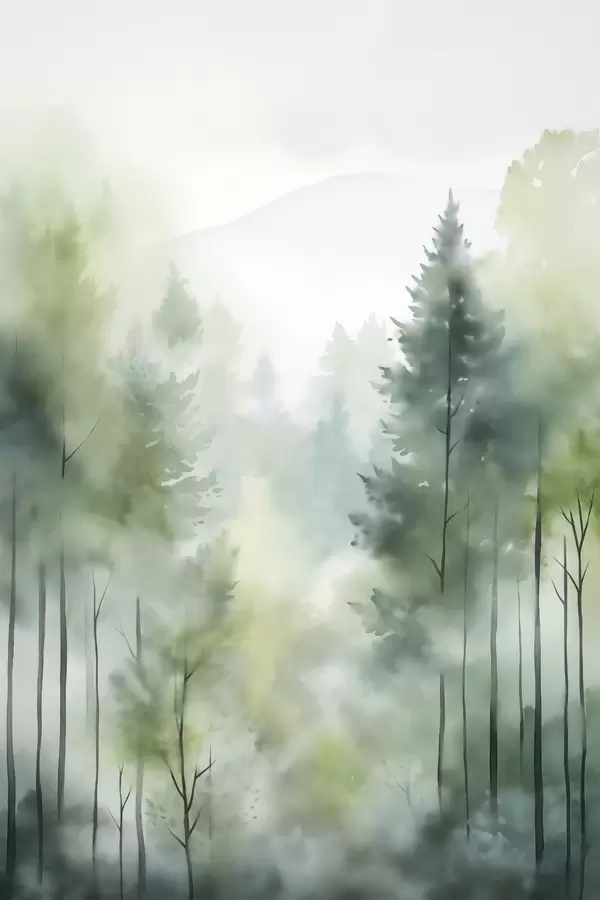 Poster Akwarelowa imitacja mglistego lasu z wysokimi sosnami i górami w tle Nr f46690