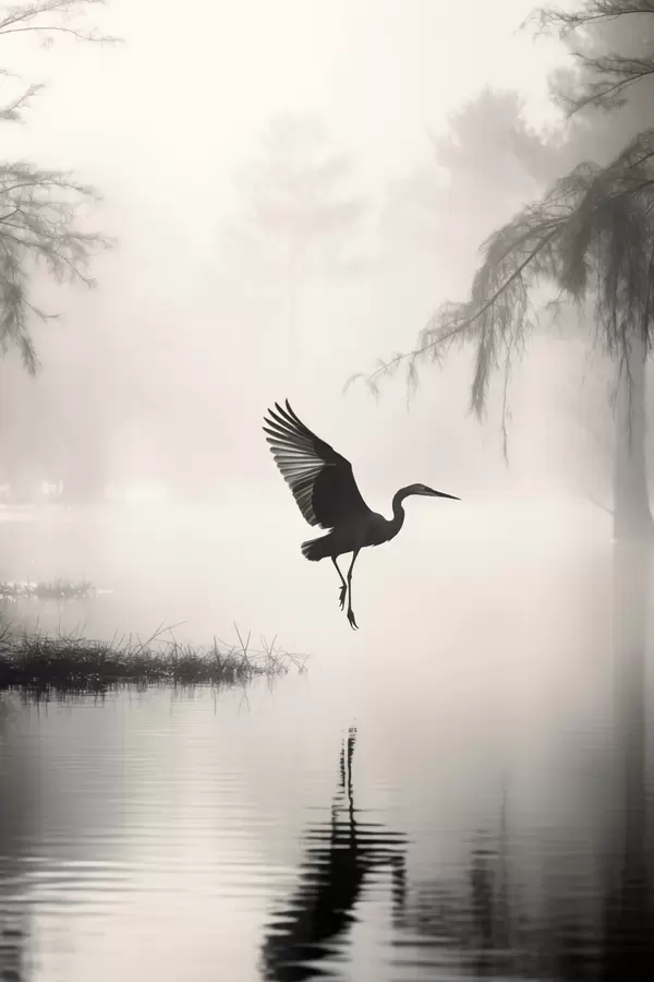 Poster Biała czapla z rozpostartymi skrzydłami, latająca w pobliżu wysokich trzcin, czarno-biała minimalistyczna kompozycja Nr f46694