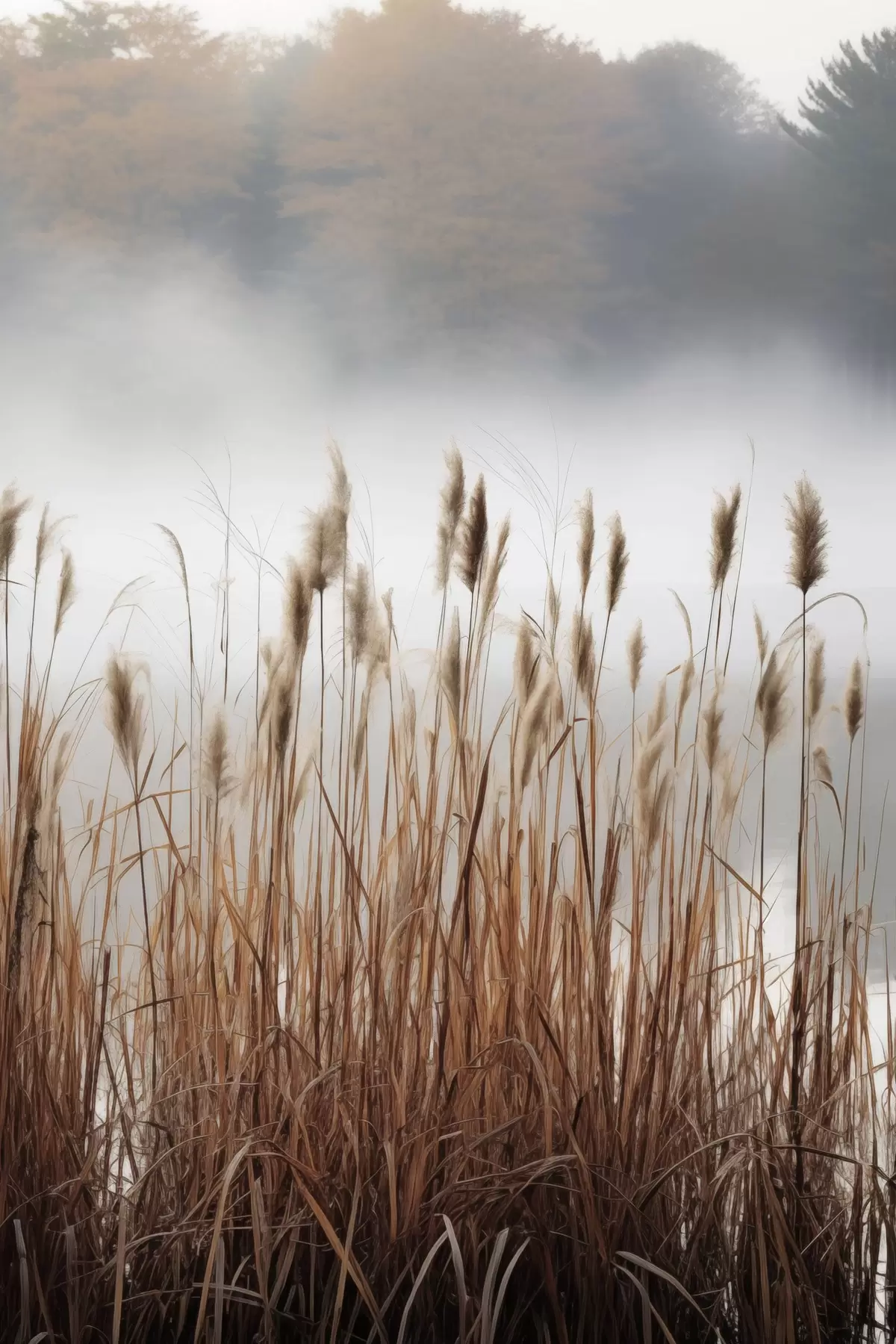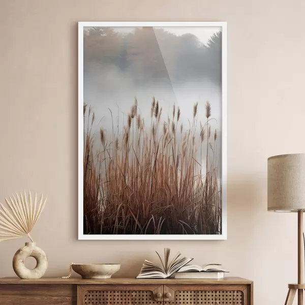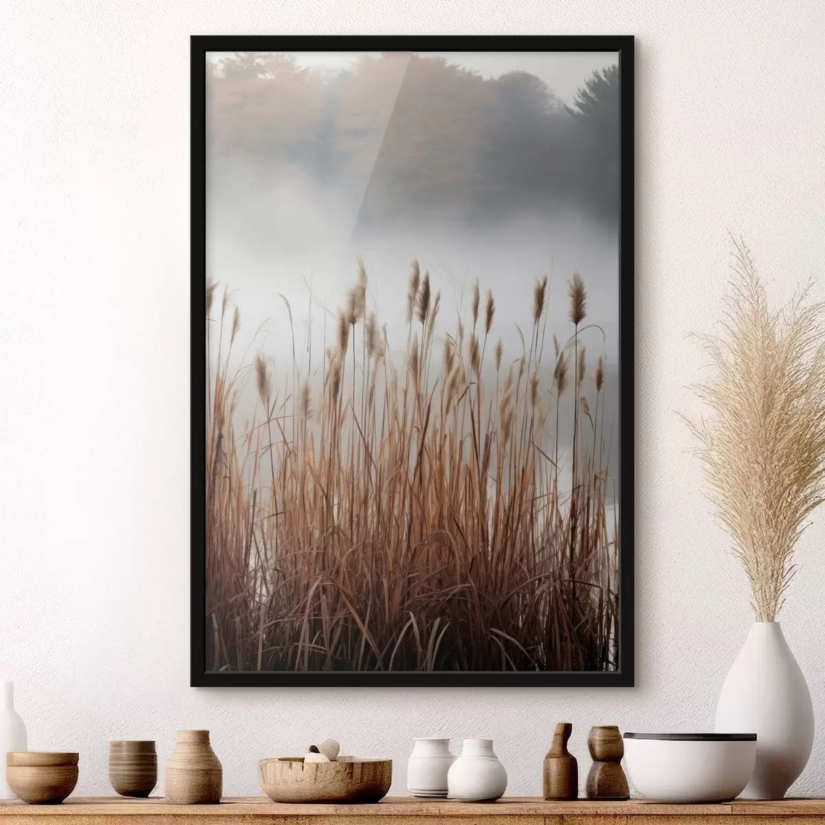 Plakat Wysokie trzciny rosnące w zbiorniku wodnym, woda odbija trzciny, mgliste tło, miękkie światło, scena natury f46696