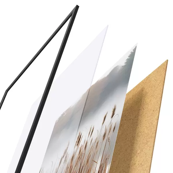 Plakat składa się z ramy, pleksi, wydrukowanego obrazu i podkładu z płyty wiórowej. Plakat można natychmiast zawiesić na ścianie dzięki uchwytom z tyłu.