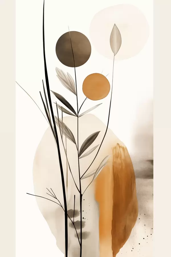 Poster Imitacja malarstwa abstrakcyjnego z pomarańczowymi i szarymi okręgami, liśćmi i gałęziami, styl nowoczesny, efekt akwareli Nr f46698