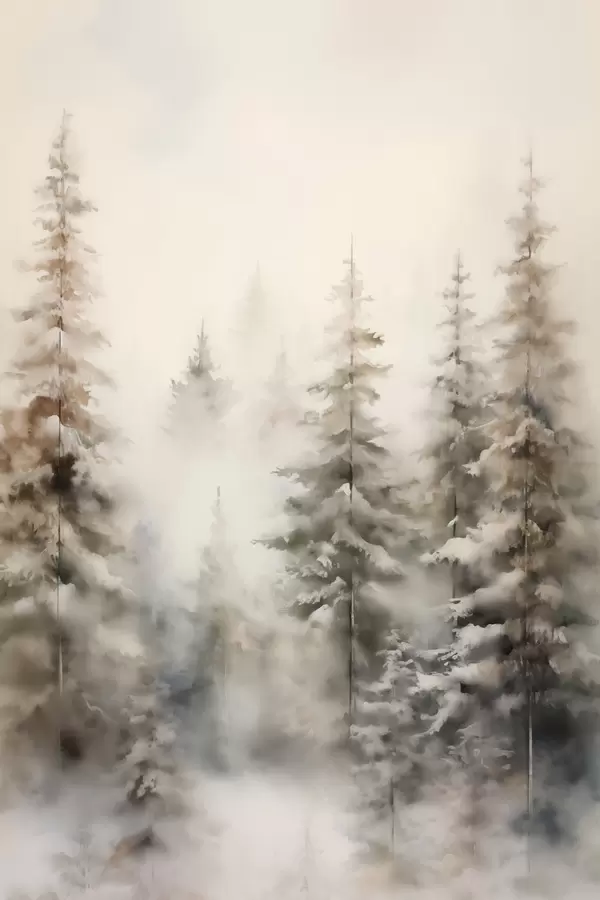 Plakat Wysokie sosny pokryte śniegiem, stojące w zamglonym lesie, delikatna, stonowana zimowa sceneria f46701