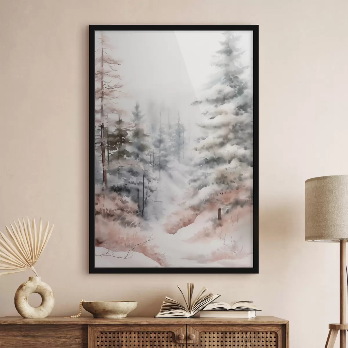 Plakat Wysokie sosny pokryte śniegiem, stojące w zamglonym lesie, delikatna, stonowana zimowa sceneria. f46702