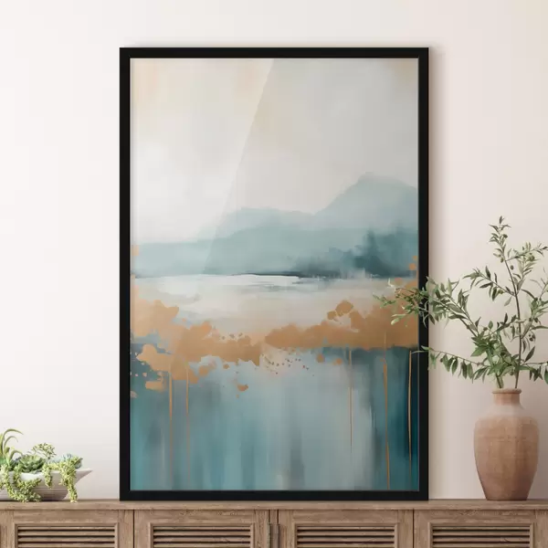 Plakat Abstrakcyjny pejzaż z górami i jeziorem w kolorze turkusowym i teksturowanej żółci, delikatne pociągnięcia pędzla, minimalistyczna grafika f46703
