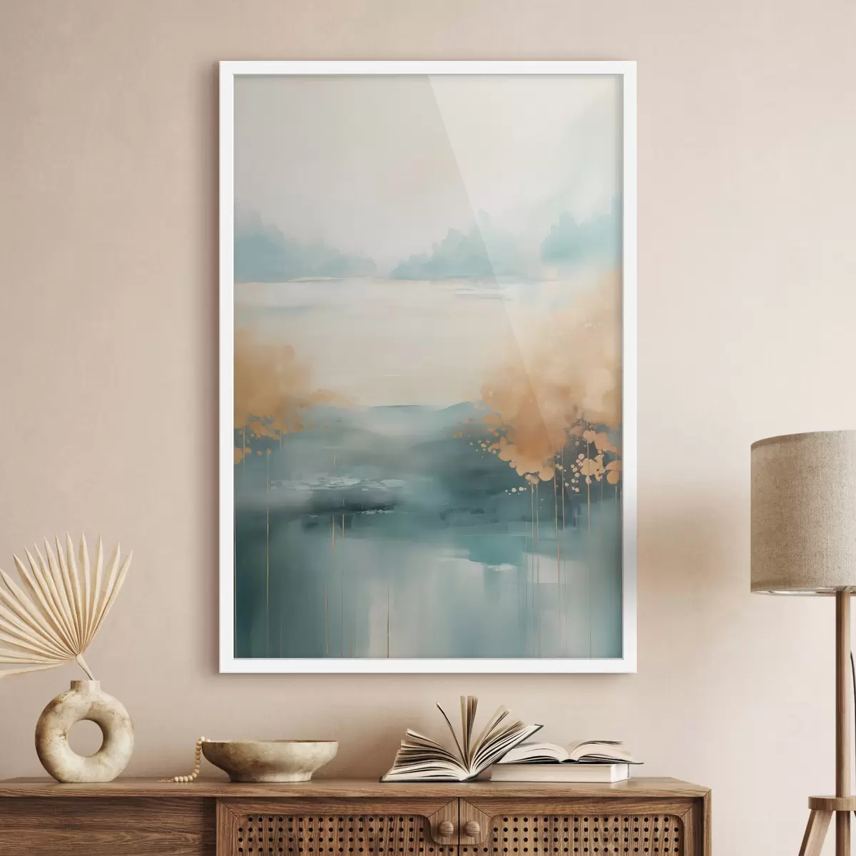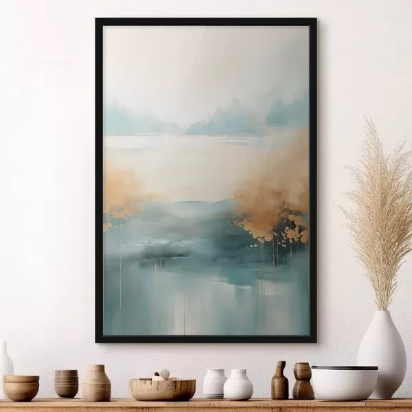 Plakat Abstrakcyjny pejzaż z górami i jeziorem w kolorze turkusowym i teksturowanej żółci, delikatne pociągnięcia pędzla, minimalistyczna grafika f46704