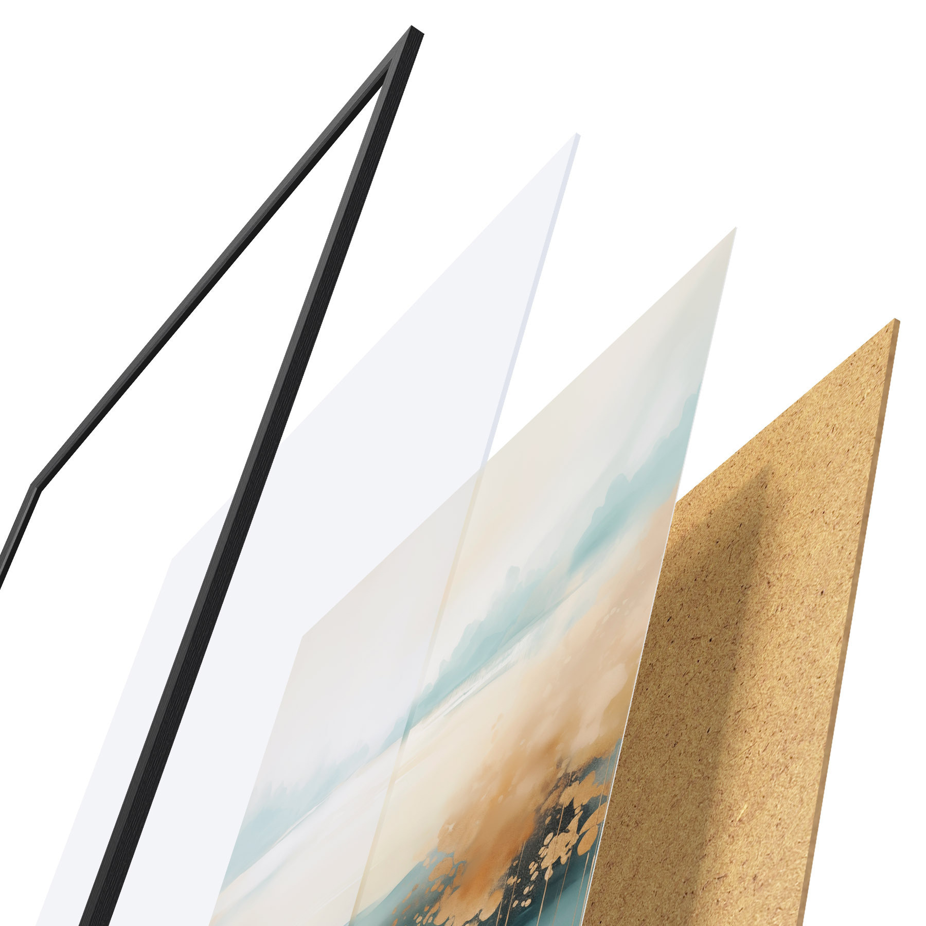 Plakat składa się z ramy, pleksi, wydrukowanego obrazu i podkładu z płyty wiórowej. Plakat można natychmiast zawiesić na ścianie dzięki uchwytom z tyłu.