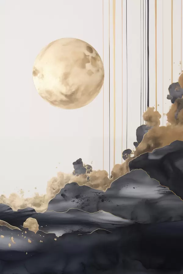 Poster Pełnia księżyca z czarnymi i teksturowanymi żółtymi chmurami, pionowymi liniami, abstrakcyjnym stylem, minimalistyczna i nowoczesna Nr f46707