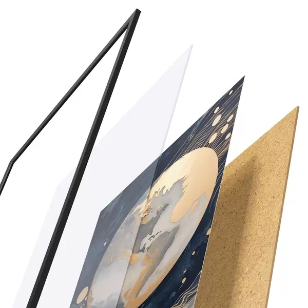 Plakat składa się z ramy, pleksi, wydrukowanego obrazu i podkładu z płyty wiórowej. Plakat można natychmiast zawiesić na ścianie dzięki uchwytom z tyłu.
