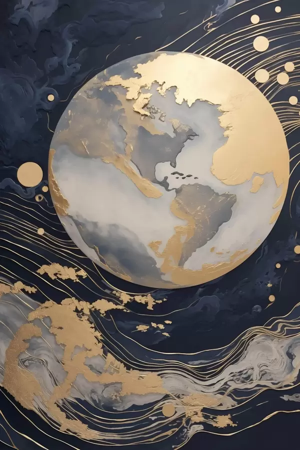 Poster Teksturowana dekoracyjna planeta z żółtymi liniami w tle, żółtymi kropkami w tle, ciemnym tłem Nr f46708