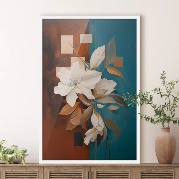 Plakat Abstrakcyjne białe kwiaty i liście na tle brązowym i niebieskim z abstrakcyjnymi kształtami, w minimalistycznym stylu. f46709