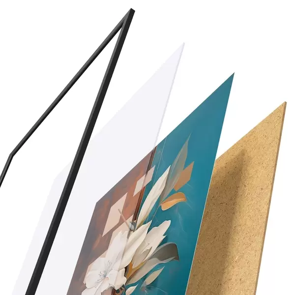 Plakat składa się z ramy, pleksi, wydrukowanego obrazu i podkładu z płyty wiórowej. Plakat można natychmiast zawiesić na ścianie dzięki uchwytom z tyłu.