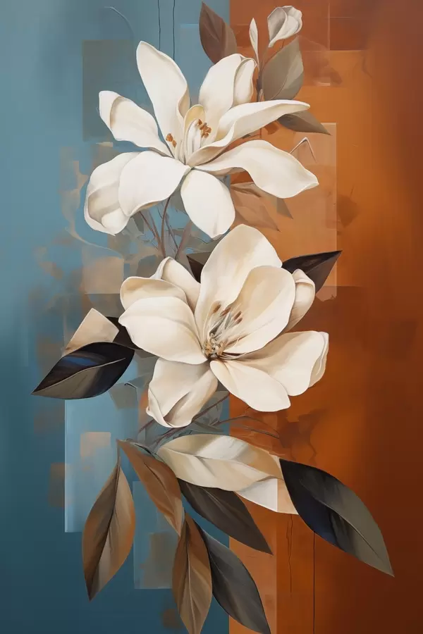 Poster Abstrakcyjne białe kwiaty i liście na tle brązowym i niebieskim z abstrakcyjnymi kształtami, w minimalistycznym stylu Nr f46710