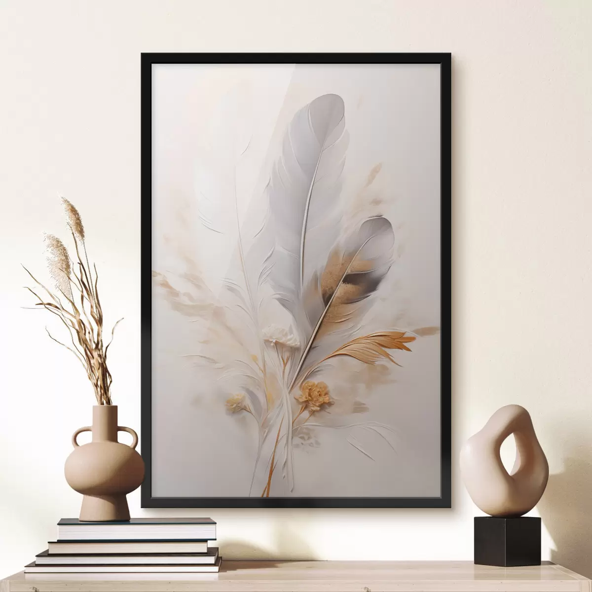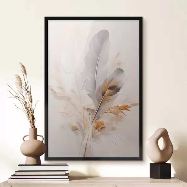 Plakat Abstrakcyjne pióra otoczone beżowymi i brązowymi piórami, miękkie i delikatne, na jasnobeżowym tle. f46712