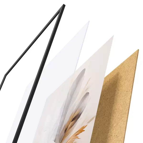 Plakat składa się z ramy, pleksi, wydrukowanego obrazu i podkładu z płyty wiórowej. Plakat można natychmiast zawiesić na ścianie dzięki uchwytom z tyłu.