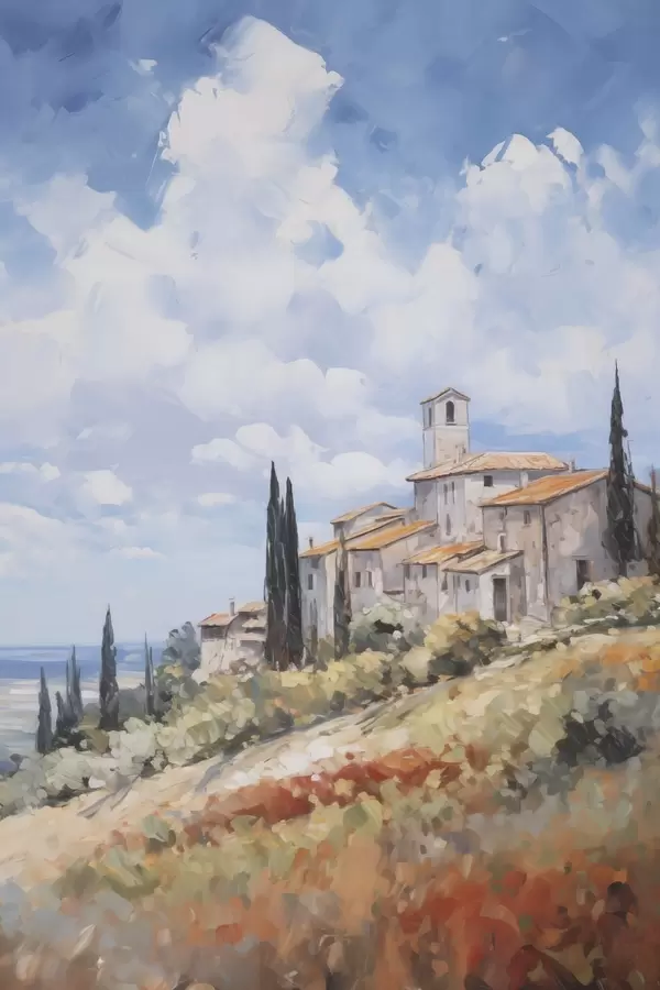 Poster Imitacja malarstwa przedstawiającego wiejski krajobraz Nr f46716