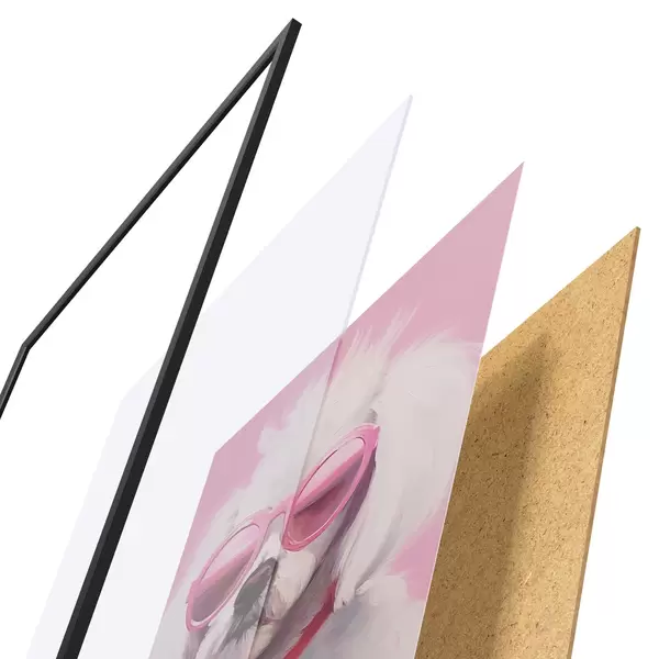 Plakat składa się z ramy, pleksi, wydrukowanego obrazu i podkładu z płyty wiórowej. Plakat można natychmiast zawiesić na ścianie dzięki uchwytom z tyłu.