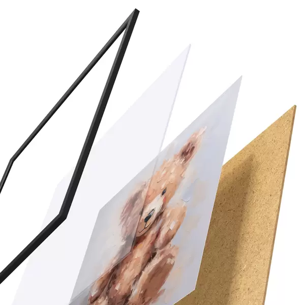 Plakat składa się z ramy, pleksi, wydrukowanego obrazu i podkładu z płyty wiórowej. Plakat można natychmiast zawiesić na ścianie dzięki uchwytom z tyłu.