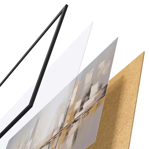 Plakat składa się z ramy, pleksi, wydrukowanego obrazu i podkładu z płyty wiórowej. Plakat można natychmiast zawiesić na ścianie dzięki uchwytom z tyłu.