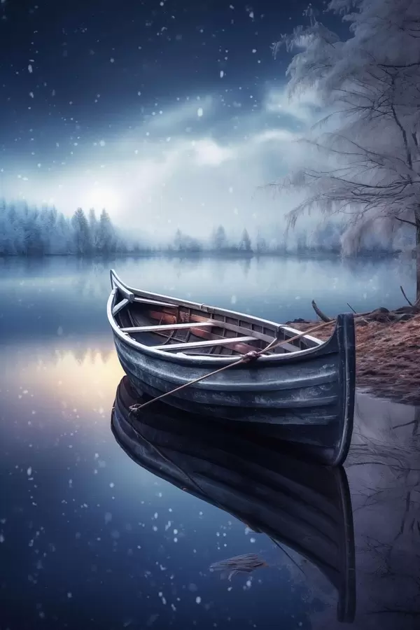 Plakat Pusta łódź nad zimowym jeziorem f46773