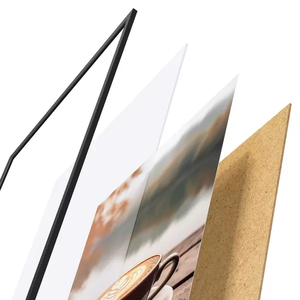 Plakat składa się z ramy, pleksi, wydrukowanego obrazu i podkładu z płyty wiórowej. Plakat można natychmiast zawiesić na ścianie dzięki uchwytom z tyłu.