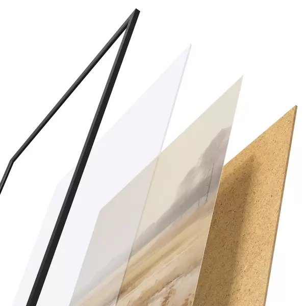 Plakat składa się z ramy, pleksi, wydrukowanego obrazu i podkładu z płyty wiórowej. Plakat można natychmiast zawiesić na ścianie dzięki uchwytom z tyłu.