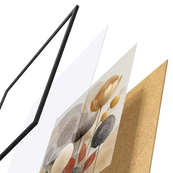 Plakat składa się z ramy, pleksi, wydrukowanego obrazu i podkładu z płyty wiórowej. Plakat można natychmiast zawiesić na ścianie dzięki uchwytom z tyłu.