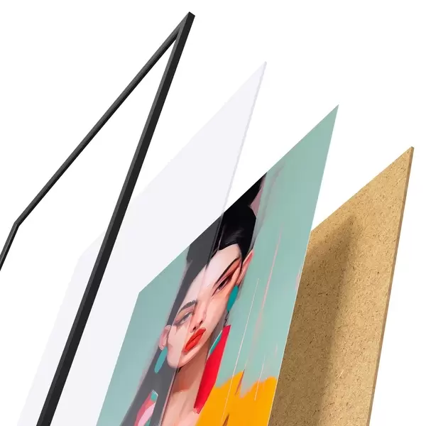 Plakat składa się z ramy, pleksi, wydrukowanego obrazu i podkładu z płyty wiórowej. Plakat można natychmiast zawiesić na ścianie dzięki uchwytom z tyłu.